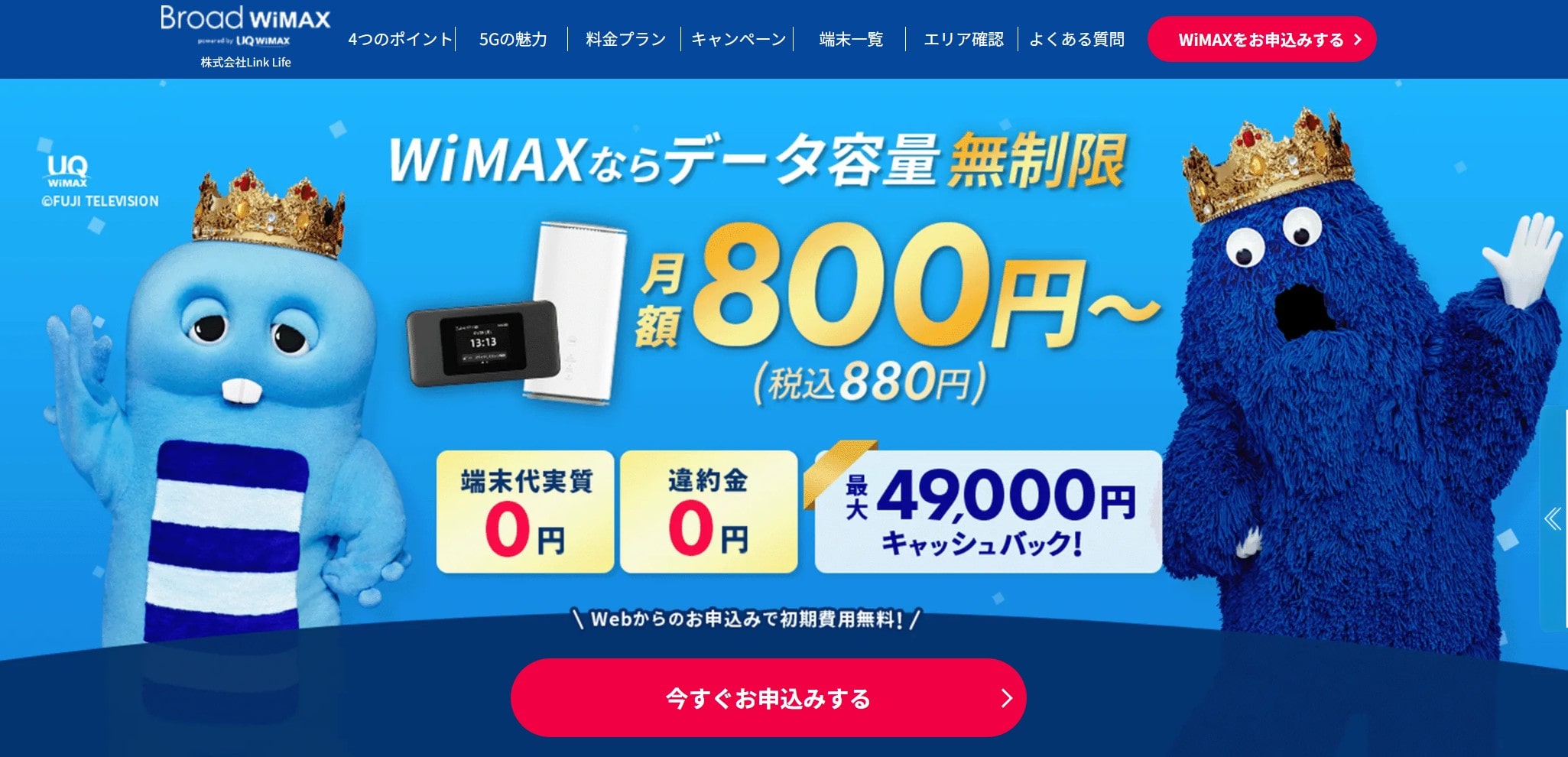 こちらは、Broad WiMAXの初期費用が無料となるお得な「初期費用無料キャンペーン」です。